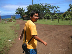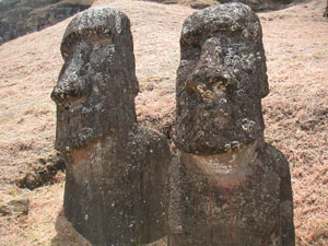 ■モアイを見たかった はじめてモアイをしったのは小学校の時だったと思う。なんか変な形で面白いなあと漠然と思ったようにおもう。この旅行を考えた時、イースター島がどこにあるかも知らなかったのだけど、とにかく「世界旅行というからには、ここだけには行こう」と思っていた。 ほんとに来てしまった。 で、感想。 いやあ、すごい。すごすぎる!予想を裏切らず、最高の体験。 モアイは問答無用ですごい。世界にはこんなすごいのがあるんだなあ。 島の滞在ものんびりしていて楽しかった。延びにのびてなんと2週間もいてしまった。 ■絶海の孤島 イースター島 はチリのサンチアゴとタヒチのまん中、周り約2000キロには全く島がない。大平洋に浮かぶまさに孤島だ。 タヒチから4時間、チリのサンチアゴから3時間半、ここを結ぶランチリ航空が週に4便あるだけで他に行き方はない。チリ領なのでスペイン語圏。スペイン語では「イスラ デ パスクア」というのだけれど、地元の人は自分の島のことを「ラパヌイ」と呼ぶ。 孤島なので長い間モアイをはじめとする独特の文化が発展した。南米ペルーなどのインカの文明と結び付けるには、似てなくもないが、かなり無理がある。それよりもむしろマオリなどの南太平洋の文化に似ていると思う。 イ−スタ−島の歴史は大きく3段階にわけられる。 モアイの時代、モアイを壊した時代、そして鳥人信仰の時代だ。 モアイの時代に関しては様々な説があるが、なぜこんなものを作ったのか実際よく分かっていない。比較的現代に近い「鳥人信仰の時代」のことはなんとなくわかっているが、スペイン人の侵略によってほとんどが殺されてしまったため、これまた詳しくは分からない。その時代のロンゴロンゴという文字ももう読める人がいない。 ■モアイはすごかった! その作り方も、作られたもの自体も、人間臭くてユーモラスで力強い。大きさもかなり大きい。行く前は、もう少し小さいと思っていた。渋谷のやつくらいだと思っていたから。全然でかい。驚いた。 モアイは島のあちこちに点在していて、全部見るにはかなり時間がかかる。 鋪装されていない道の先にもあるので、レンタカーでばーっと回って丸一日というところかな。 どの遺跡もそれぞれ特徴があって、モアイの形も時代によって少しづつ変わっていったことがよくわかる。 初期のころのものは小さくて写実的だ。人間の形をモデルにしているのがよくわかる。後期のは、すごく大きいのだけれど、ある程度画一的な顔になってくる。 ラノラルクというモアイを切り出していた岩山にあるモアイはとくにその傾向が強い。どのモアイも顔が似ている。大量に生産するために、形にある一定の決まりがあったのかもしれない。