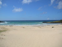 ■モアイのいる場所[3] アナケナ海岸 イ−スタ−島の端にある小さなビーチです。水はとてもきれいで、波がない時は本当に穏やかで美しいビーチです。 お店はないので、水やビール、食べ物は自分で持っていかなくてはなりません。 このビーチのほとりにプカオ(ぼうし)をかぶったモアイが並んでいます。モアイごしに泳ぐというのはなんともいい気分。 このビーチはお気に入りで4回いったよ。 |