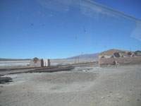 ![]() チリ出国手続き所付近。出国したあと、ボリビア側の入国事務所までは砂漠の道を1時間。つまりその間はチリにもボリビアにも入国していない状態。 ここはまだ国境事務所の近くなので鋪装されている。 ![]() ここが国境。遮断機みたいなのがそうです